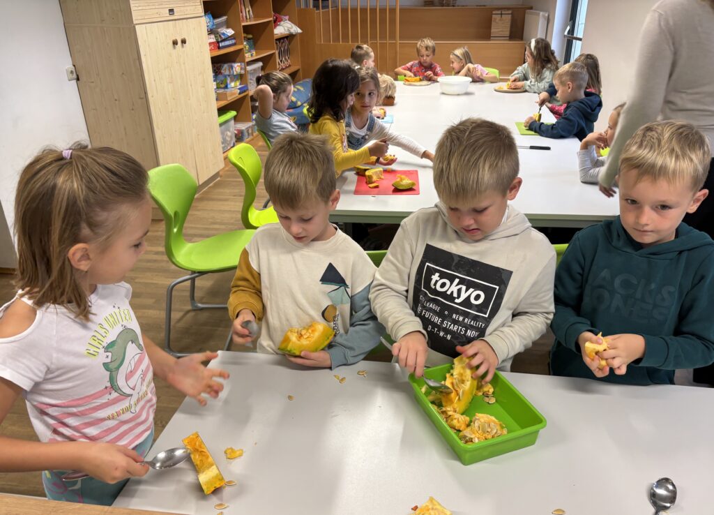 In der ersten Klasse wird Kürbissuppe gekocht. Mmmh, schmeckt nach Herbst!