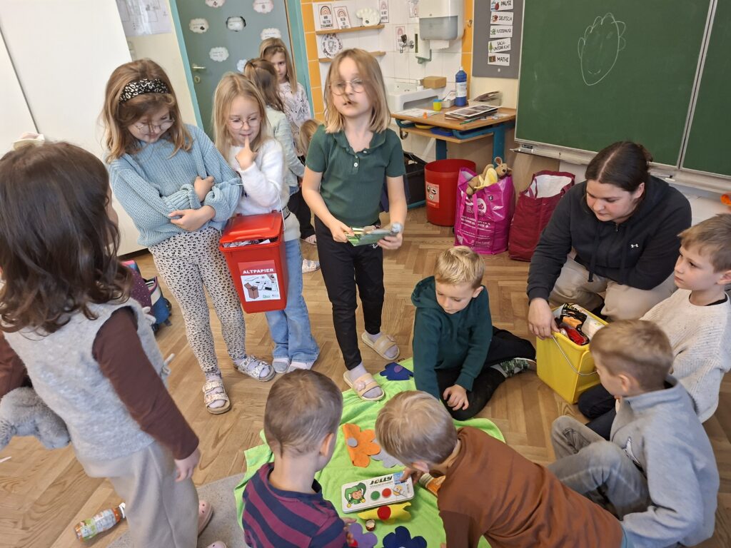 Abfallberaterin Miriam Burger vom AWV Weiz macht den Kindern der ersten Klasse bewusst, wie wichtig Mülltrennung für unsere Umwelt ist. Die Kinder hören gespannt zu und bringen ihr bereits vorhandenes Wissen ein.