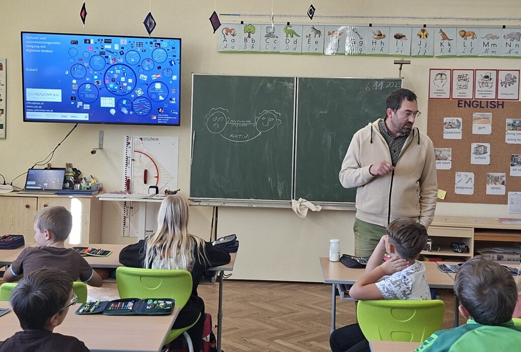 Die Schülerinnen und Schüler der vierten Klasse verfolgen die Erklärungen und Demonstrationen des IT-Experten von der Koordinationsstelle SAFER INTERNET mit großem Interesse. Es geht um Sicherheitseinstellungen am eigenen Mobiltelefon, um Gefahren im Netz, aber auch um Auswirkungen bei unbedachtem Umgang mit digitalen und sozialen Medien.